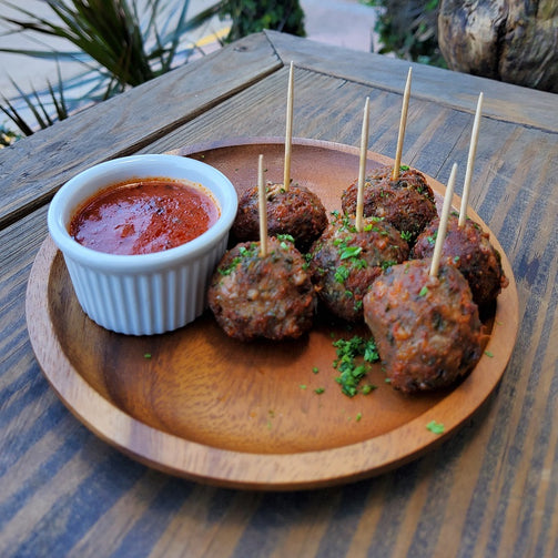 Minced Beef Balls made with garlic, parsley & herbs served with our housemade tomato based marinara dip and freshly baked bread.