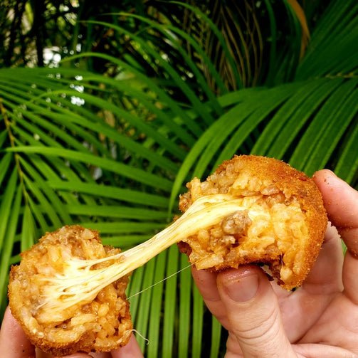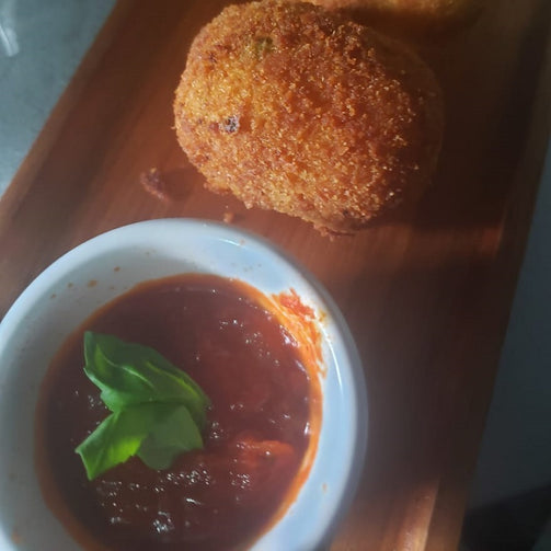 Fried Italian Slow Cooked Risotto Rice Balls with your choice of Spicy Bacon, Beef or Green Peas and Onions stuffed with Mozzarella Cheese surrounded with Italian bread crumbs.