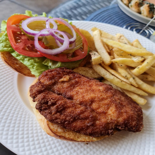 Breaded & Fried Chicken, Mayonnaise, Red onions, Pickles, Lettuce & Tomatoes